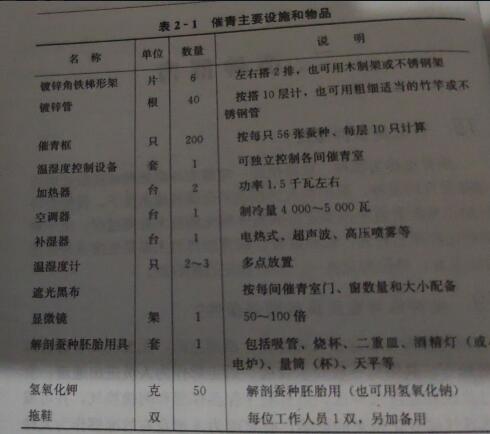 催青所借设施和物品数量应根据蚕种及所用房屋多少而定,一般一间催青室栋存放10000张左右蚕种计算催青主要设施和物品见表2-1
